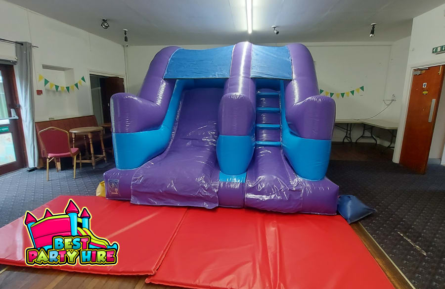 A 5ft party-themed inflatable slide where children climb up soft foam steps on the right-hand side and slide down the left.