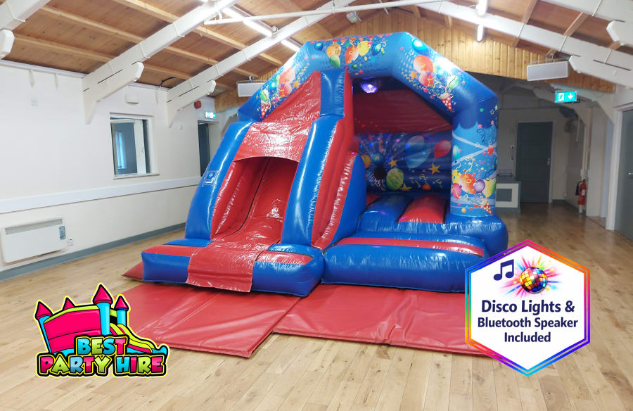 A party-themed bounce and slide castle featuring a front slide, built-in disco light, and a Bluetooth speaker for playing your own music.