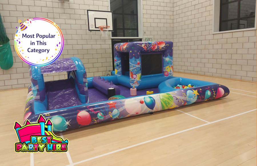 A fully enclosed toddler play zone featuring a small bouncy castle, slide, ball pool with air jugglers, and six soft play shapes, all in a blue party theme.