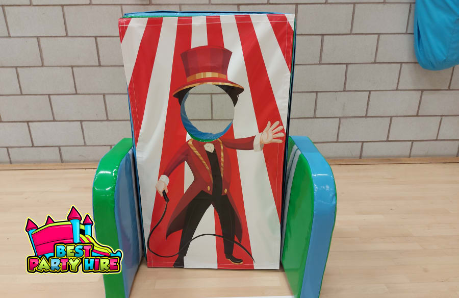 A circus-themed soft play selfie spot created for fun photo opportunities at children’s parties and events.