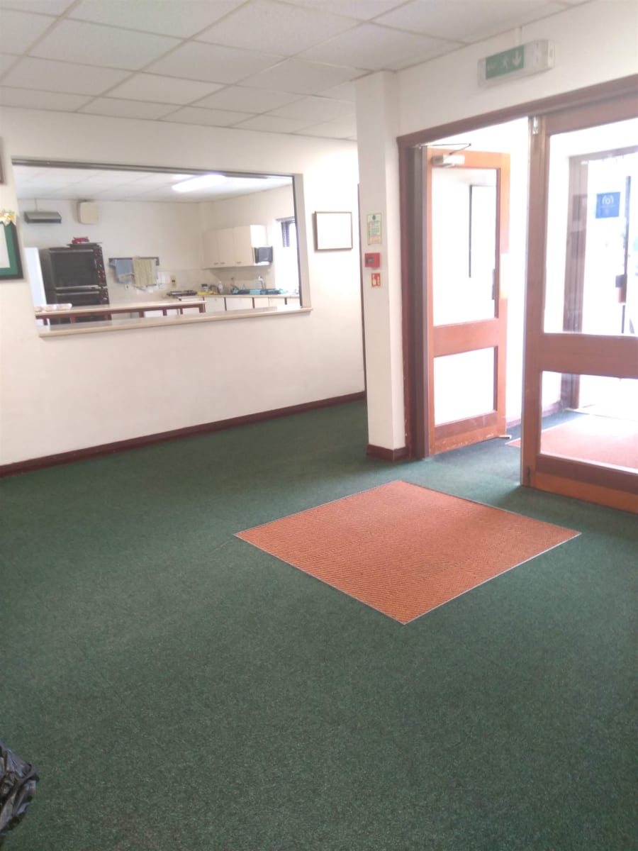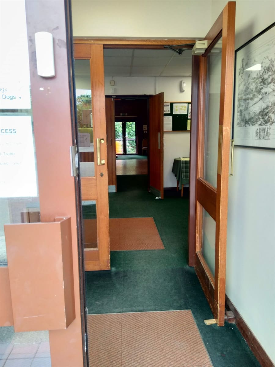 Ahead is the doors for the main hall and right you will see the entrance to the kitchen.