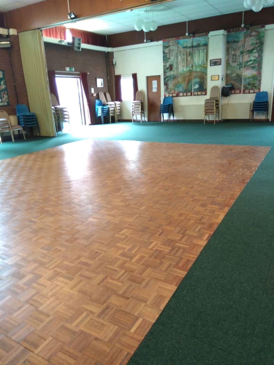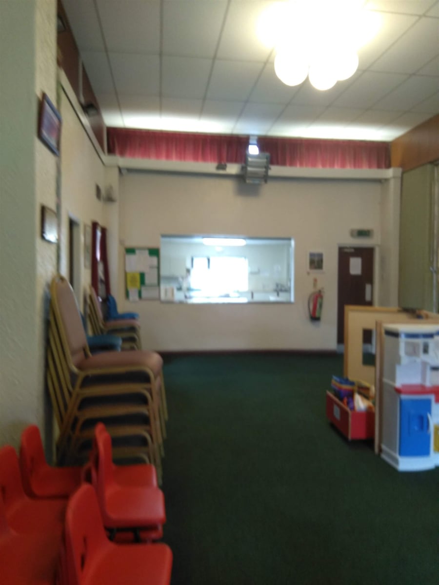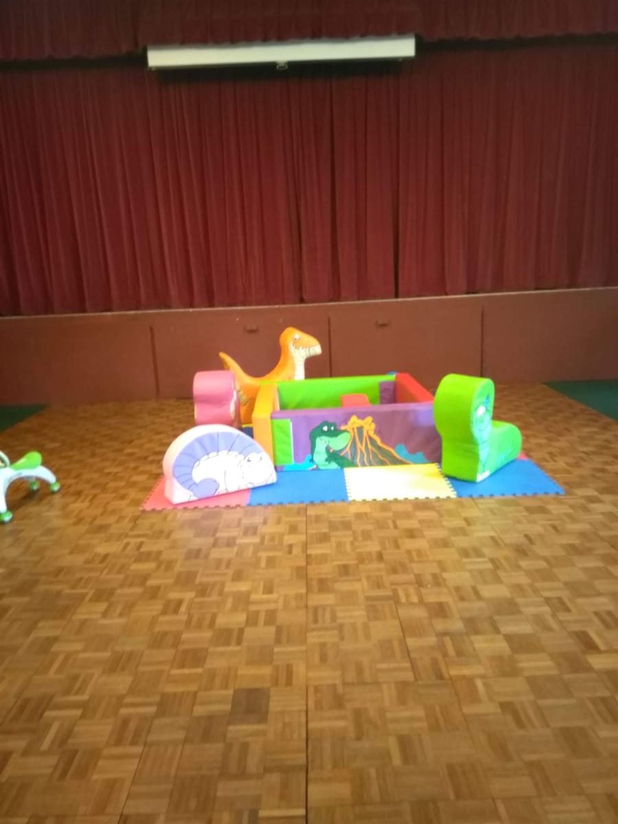 It is a large hall with a stage. The hall holds various activities and play groups. You can divide the hall in half with a divider if needed