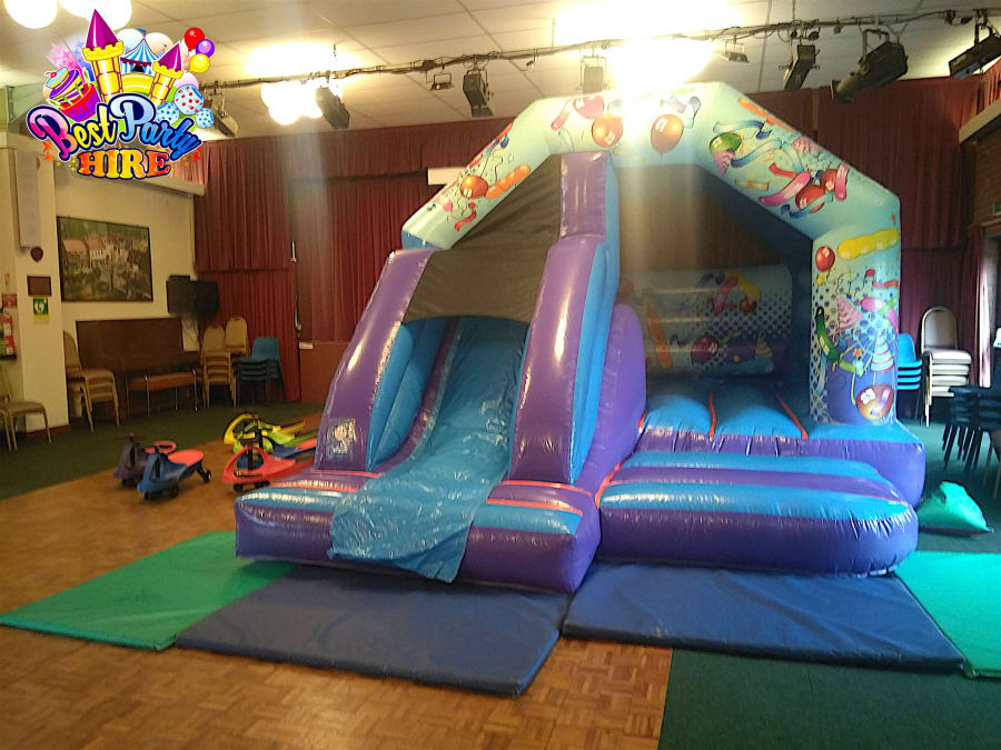 There is also an outside space, part grass and part slabs. Our medium castles will fit on the grass space. So if the weather is nice, you have the option of having the inflatable outside.