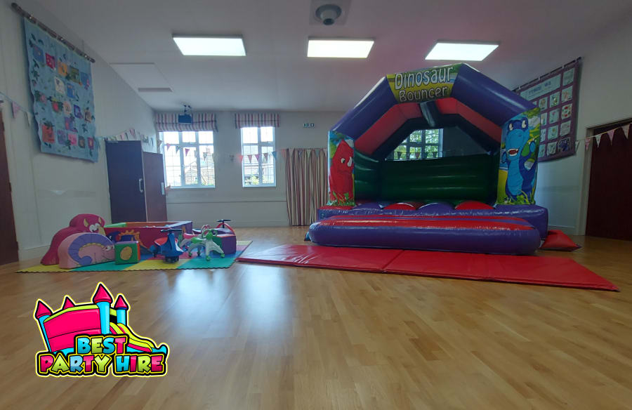 There is a modern kitchen on site, making it easy to organise food, drinks and cake time. In the main room there is also a stage, which is great for entertainers, party games or performances, but it does influence where inflatables are placed. Setups are usually arranged to work safely around the stage area.